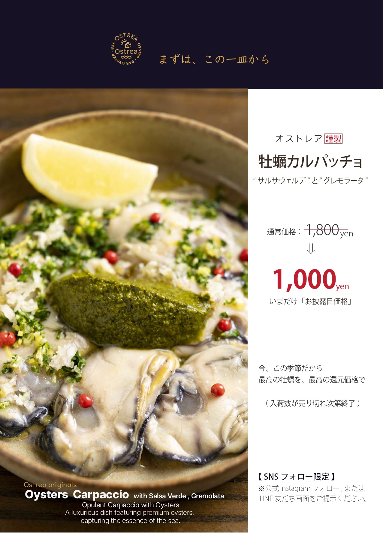この度、構想から半年。ついに納得のクオリティに達した新名物「オストレア謹製 牡蠣カルパッチョ」が完成いたしました。