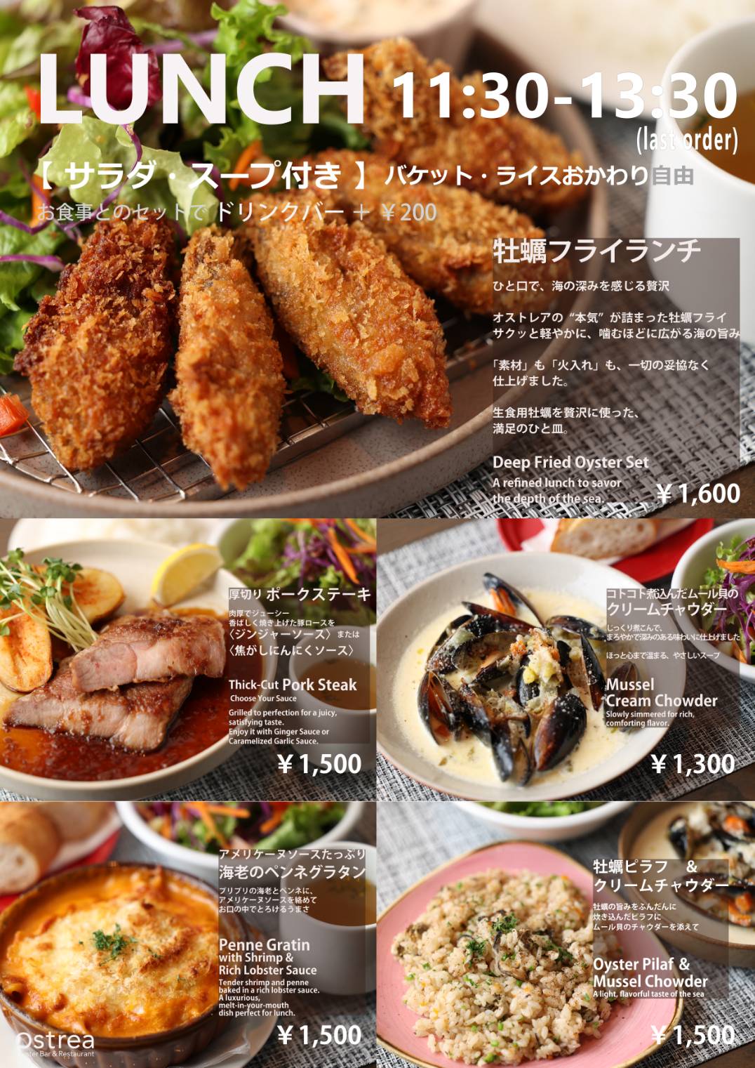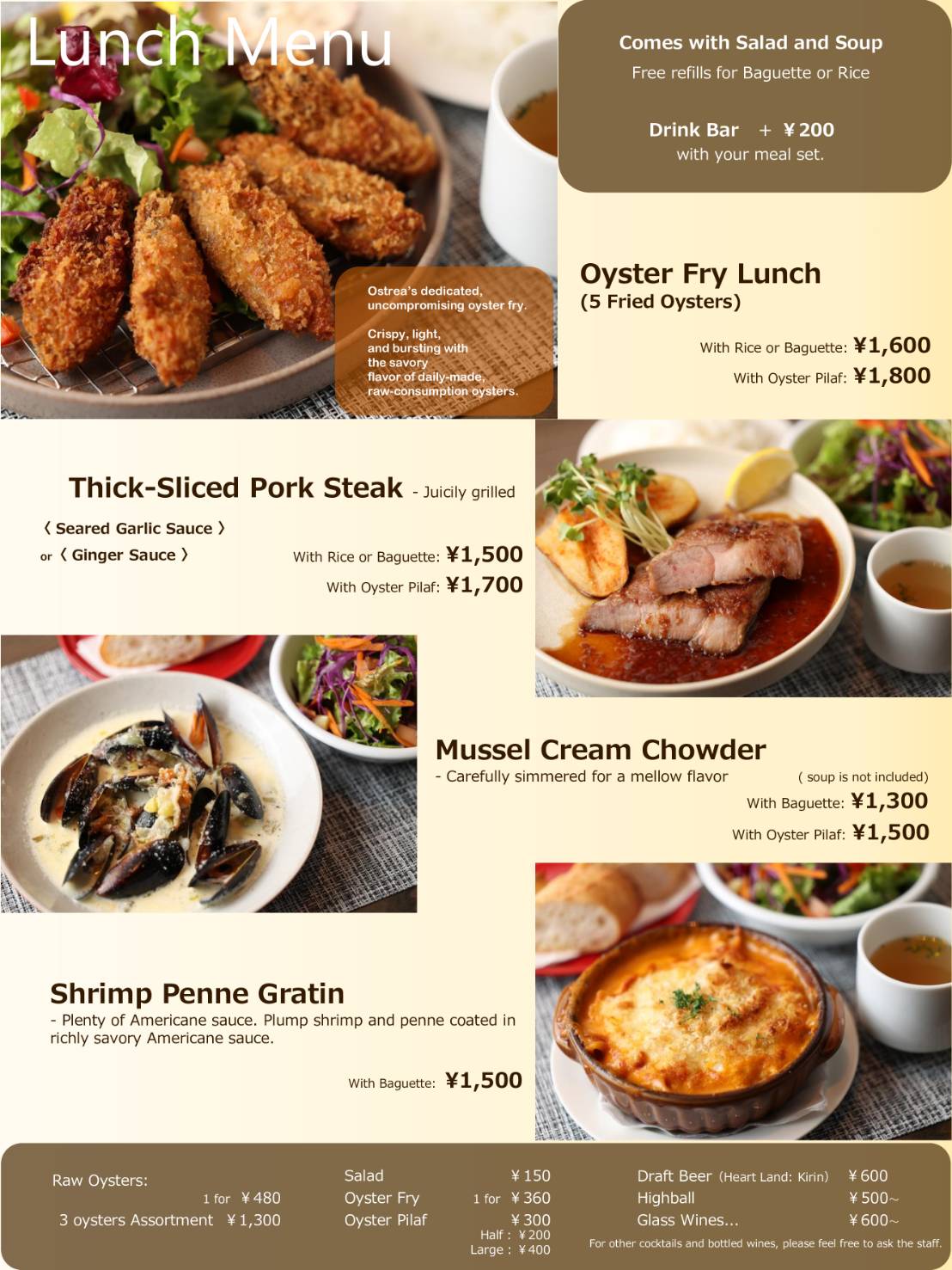 忙しいビジネスの合間にも、当店の自慢の料理と厳選された牡蠣で「手軽な贅沢」をご堪能いただき、午後の活力となるような至福のひとときをお届けいたします。